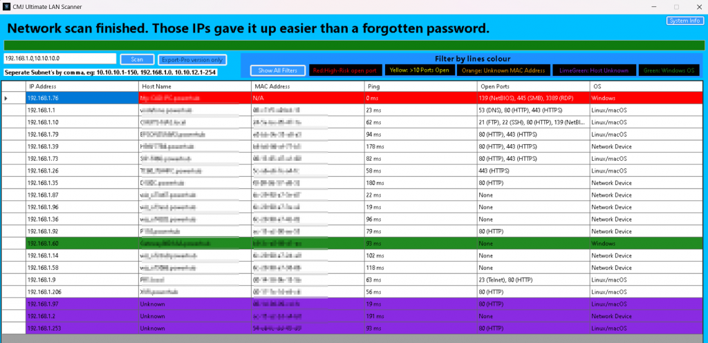 Scan your network for devices, export as .csv, filter by column or type.