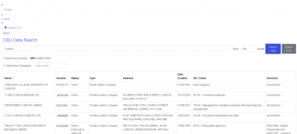 CMJ Get Data, search companies house database with lightning fast results. Paid version will include directors search. We will be developing this app further to us AI and get contact details.